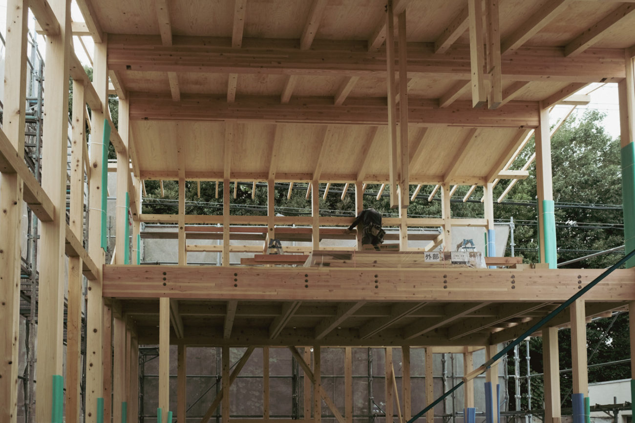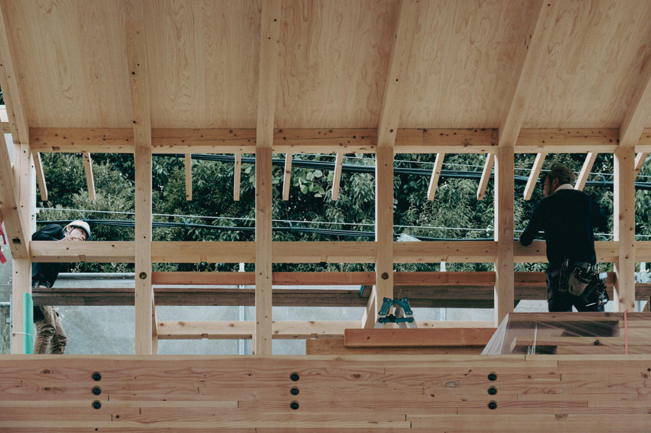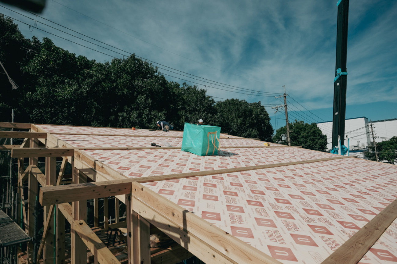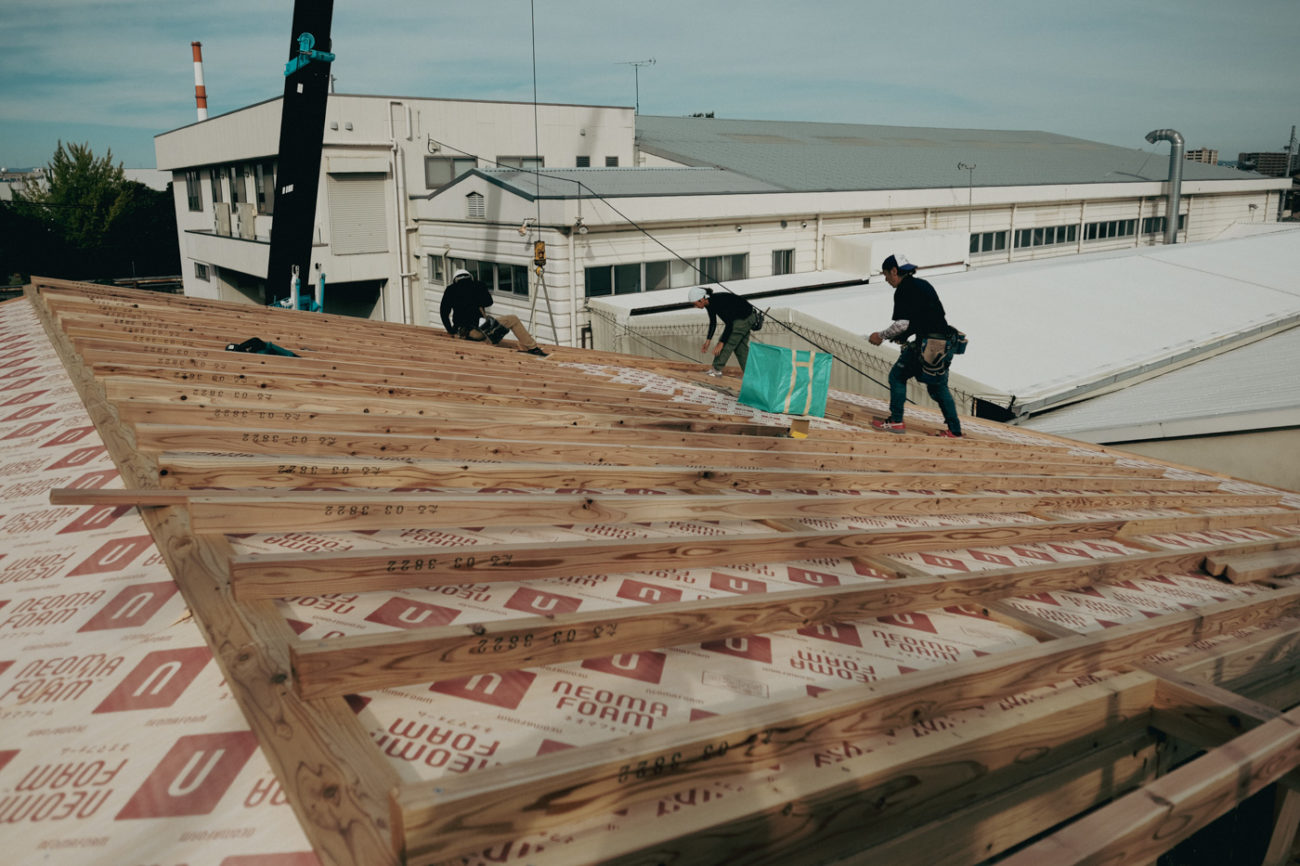 棟上げ3日目です。 本日は垂木の施工まで進みました。 屋根の輪郭があらわれ、建物がよりどっしりとした佇まいになってきました。 母屋と断熱材の取り付け、母屋間にネオマフォームの95mmを入れています 母屋の取り付いたところ 垂木の取り付け 室内から垂木の骨組みが見える
