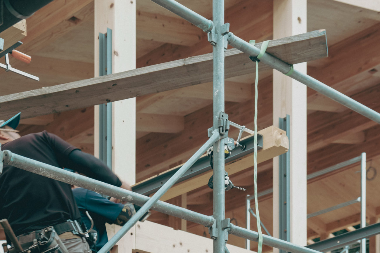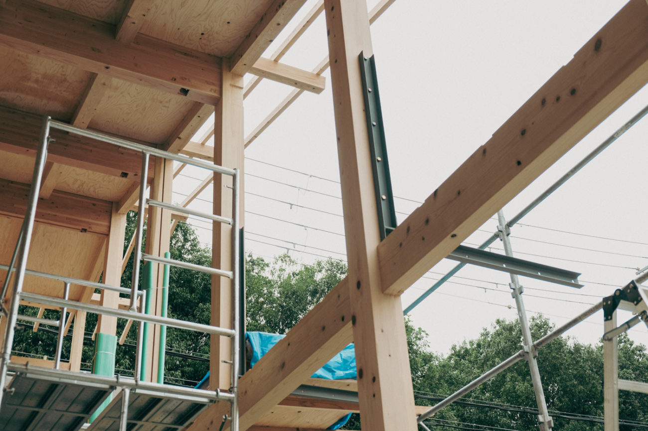 補強材に4寸角の桧材を取り付けます 先端部をまた4寸角の桧材でつなぎます 今回、構造材があらわしとなるため、垂木上の野地板を貼る前に電気配線を行います