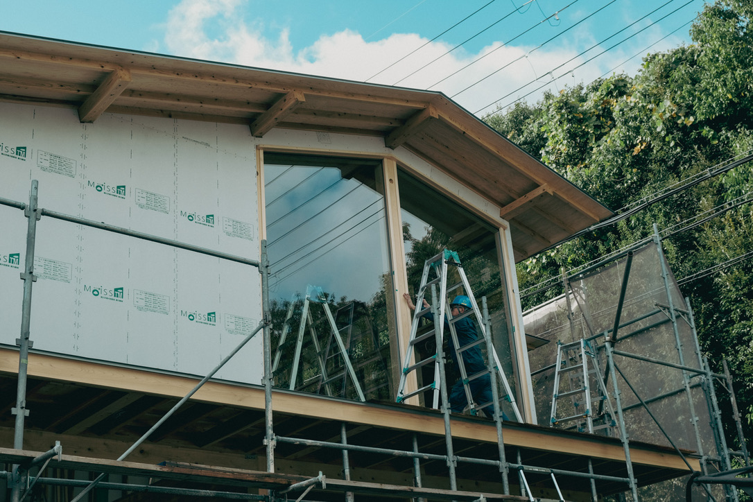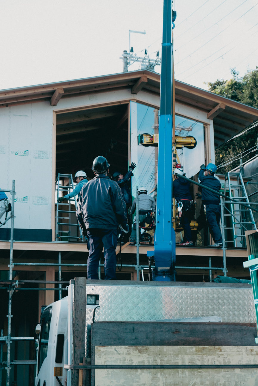 1枚あたりのガラス重量は約200kgもあり、特に2階部分のガラスはクレーンを使って慎重に作業を進めていただきました。