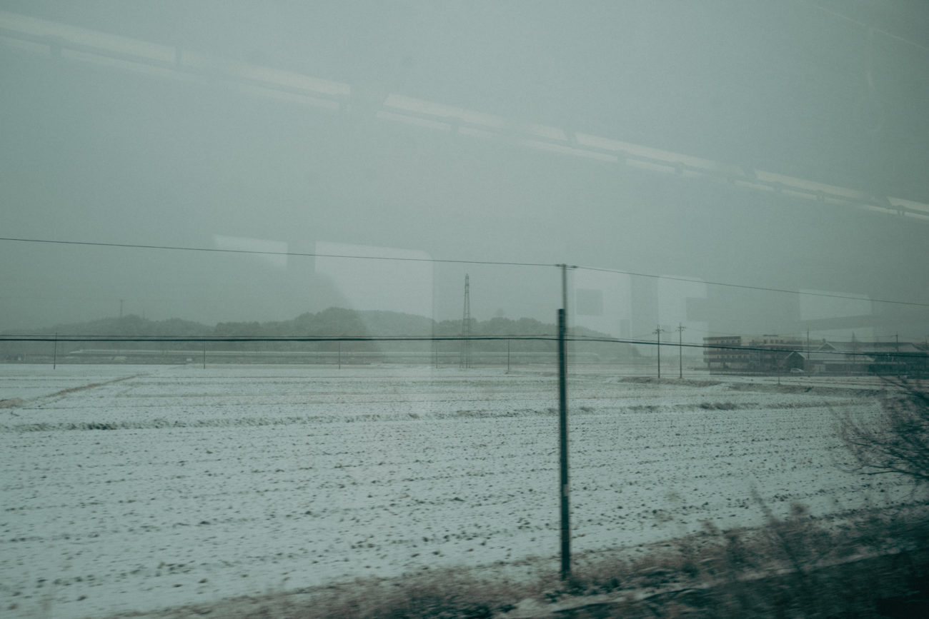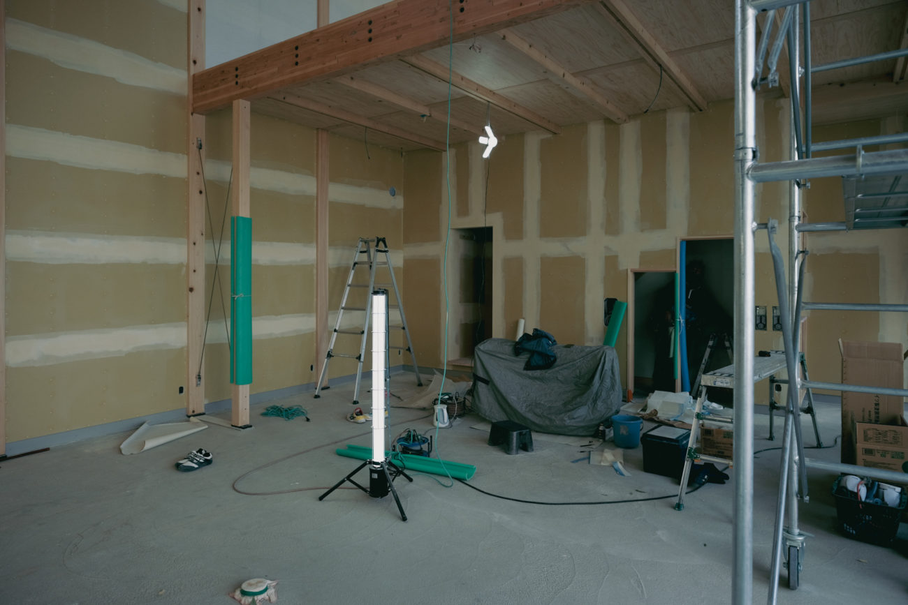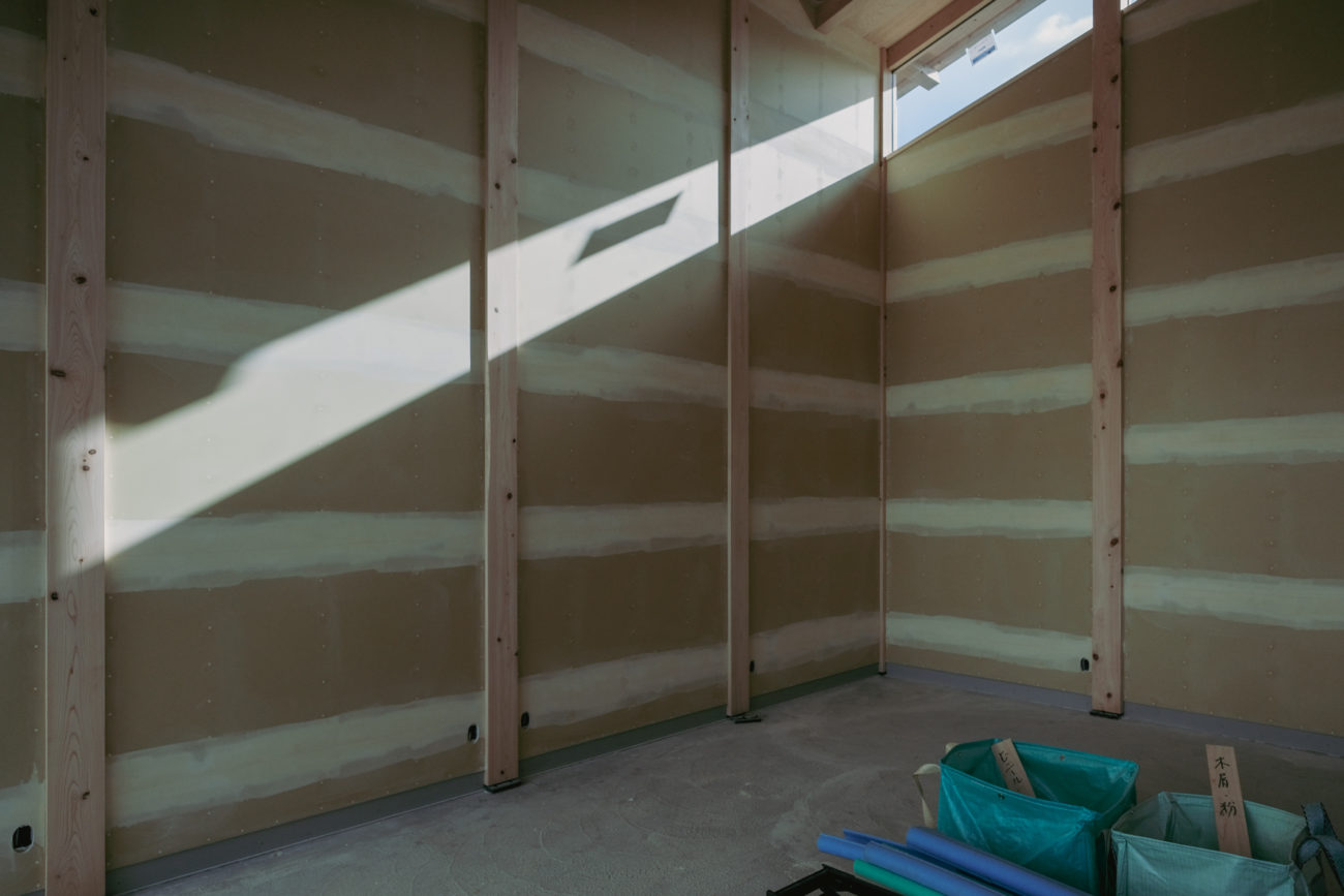 彦根は雪が降り、寒い一日となりました。 ロールスクリーンの打ち合わせのため電車で現場へ向かいました。 途中、窓の外は雪景色。白く染まった風景が広がり、冬の美しさを感じます。 現場到着後は晴れて、ハイサイドライトからは太陽光が パテ処理が完成し、下地用の紙クロスが貼り始められていました。この上から漆喰をローラーで塗る仕上げとなります。