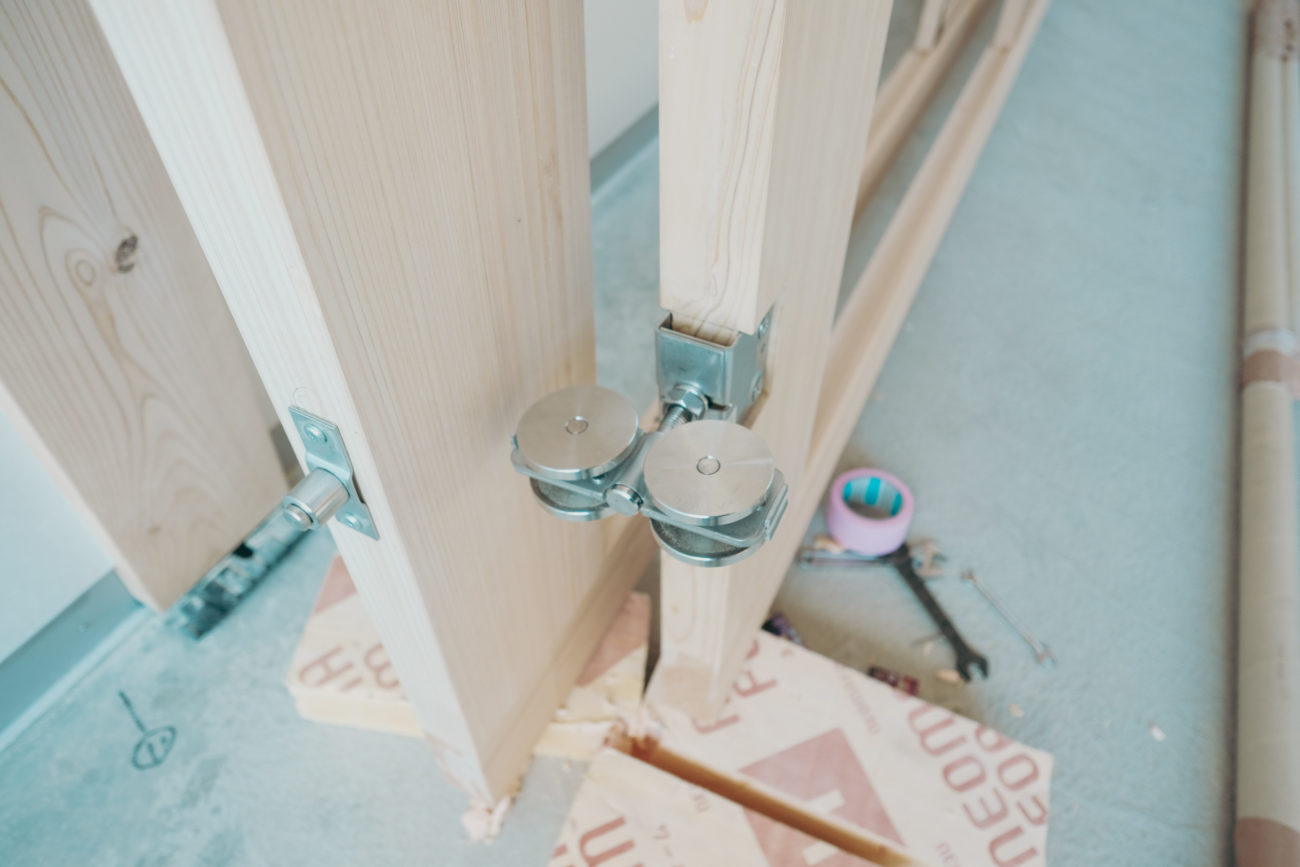 吊り戸用の滑車とガイドローラーを取り付けます