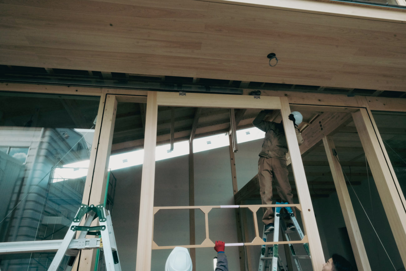 レールに建具を滑り込ませます、建具中央の治具は建具屋さんが一人で作業できるよう工夫されたものです。