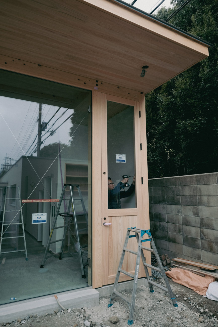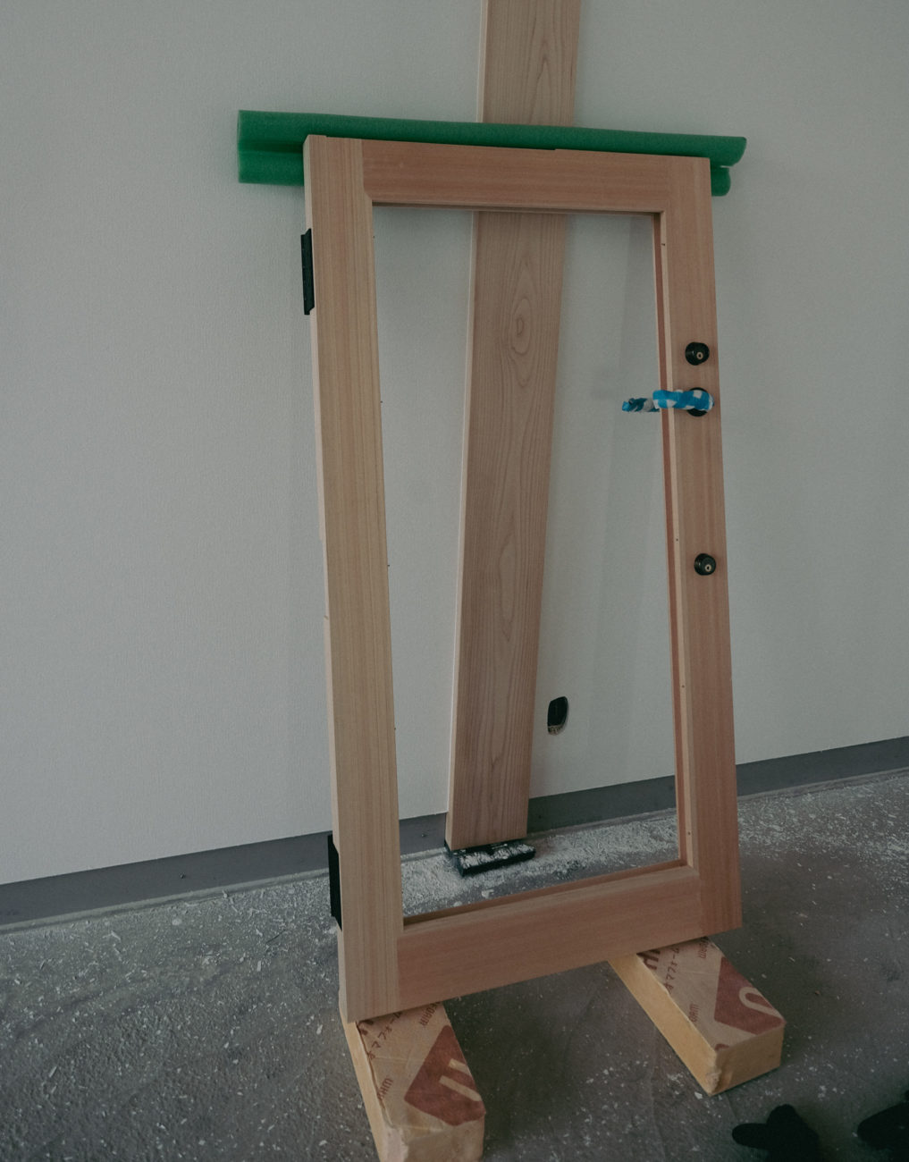 開き戸も設置が完了し、ガラスを入れてもらいました。押え縁を取付中。 こちらは階段室を上がったところに設ける建具です。採光を確保しつつ、大判ガラスを掃除するための出入口も兼ねています。 漆喰の仕上げも進んでおり、完成形が見えてきました