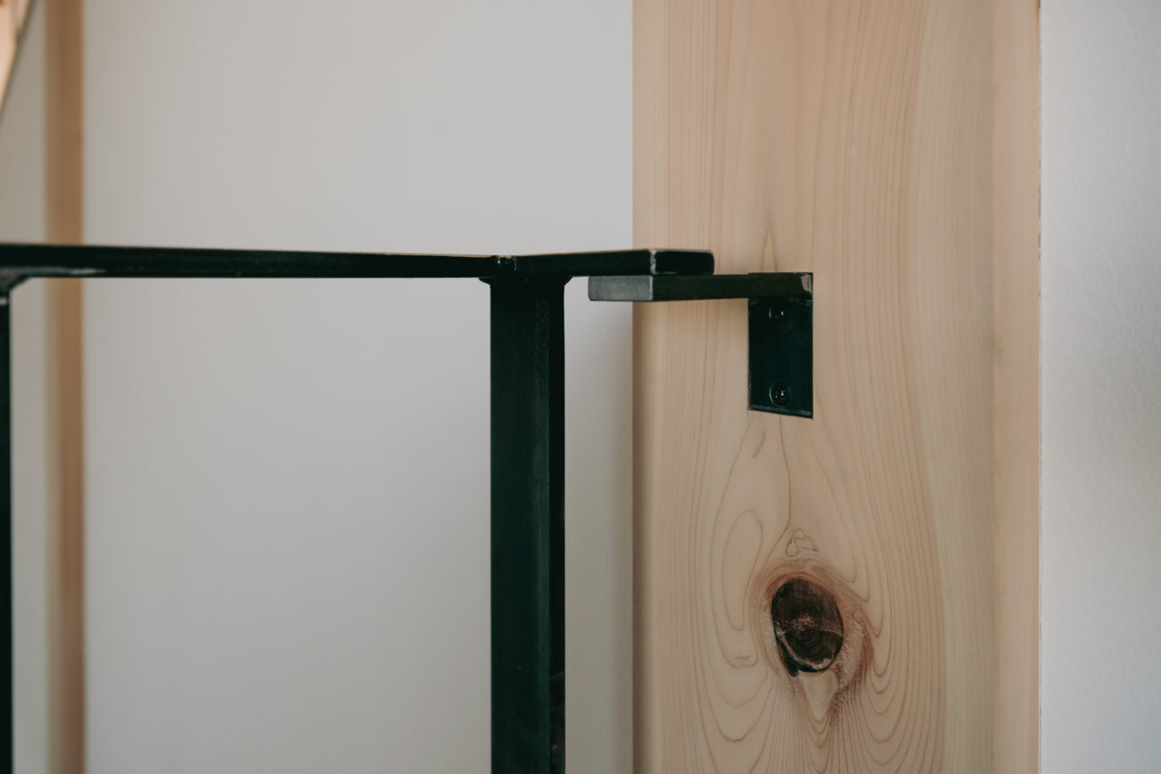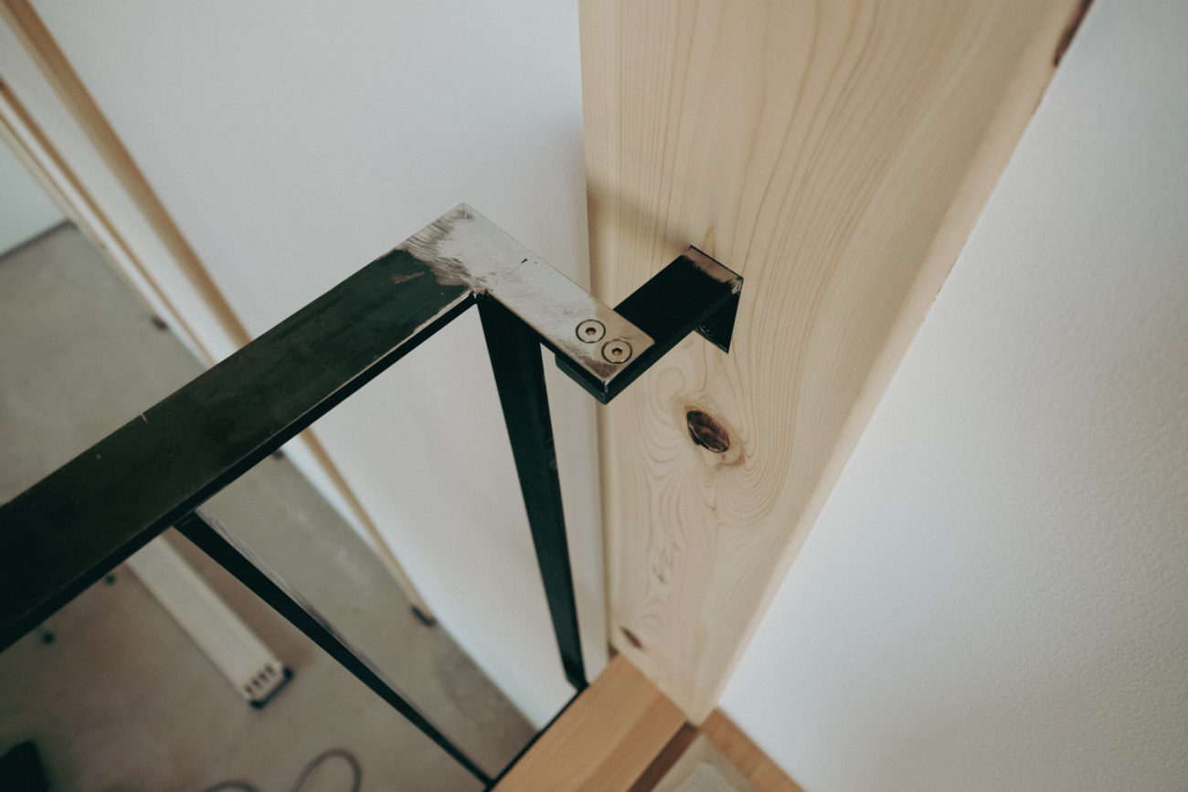 石山のギャラリーでは吹き抜け部の手すりの設置が完了しました。 梁の正面からM8の皿ビスで固定しています。 材料は黒革鉄、一部を現場で溶接を行うことで、すっきりとした納まりを目指しました。 溶接した部分はシルバーになります、塗装は後日 端部のディテール 端部のディテール、別角度から