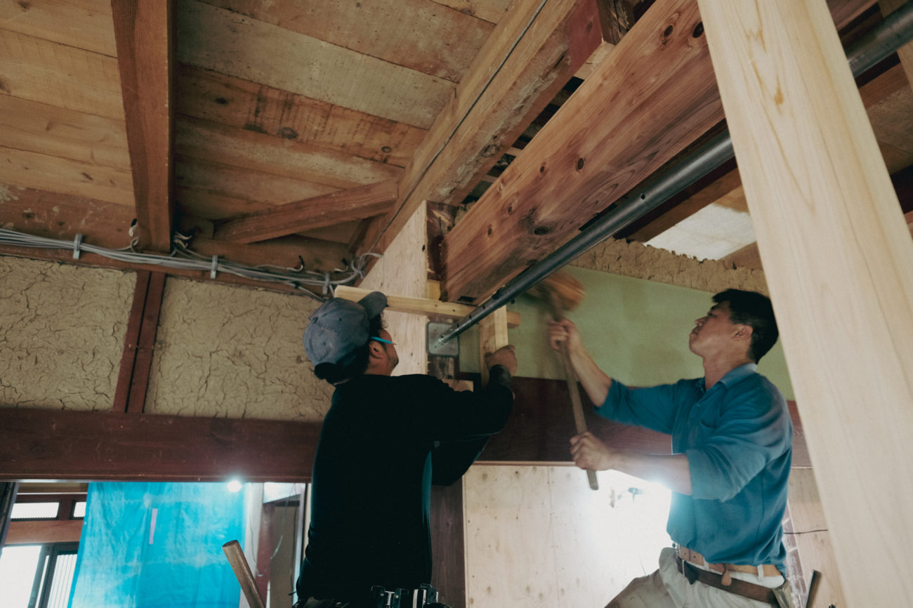 彦根市にて古民家のリノベーションが始まっています。 梁を入れている場所はダイニングとリビングがつながる箇所です。 差鴨居の位置が低く空間を分断してしまうので、差鴨居を撤去して構造補強のため梁を入れています。 耐力壁として構造用合板による補強も行っています。