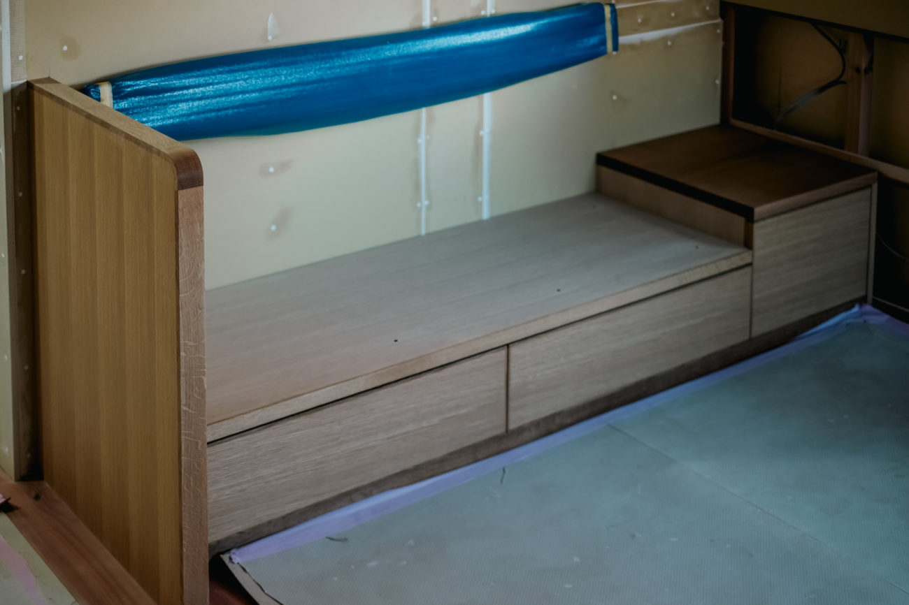 家具工事が進んでいます。 田中さんにソファベンチの取付をしてもらいました。 上部がソファベンチ下部が収納となっています。 背もたれも造り付けで設えました。 左の板も背もたれにすることができ、ソファの上に足をのばすことができます。