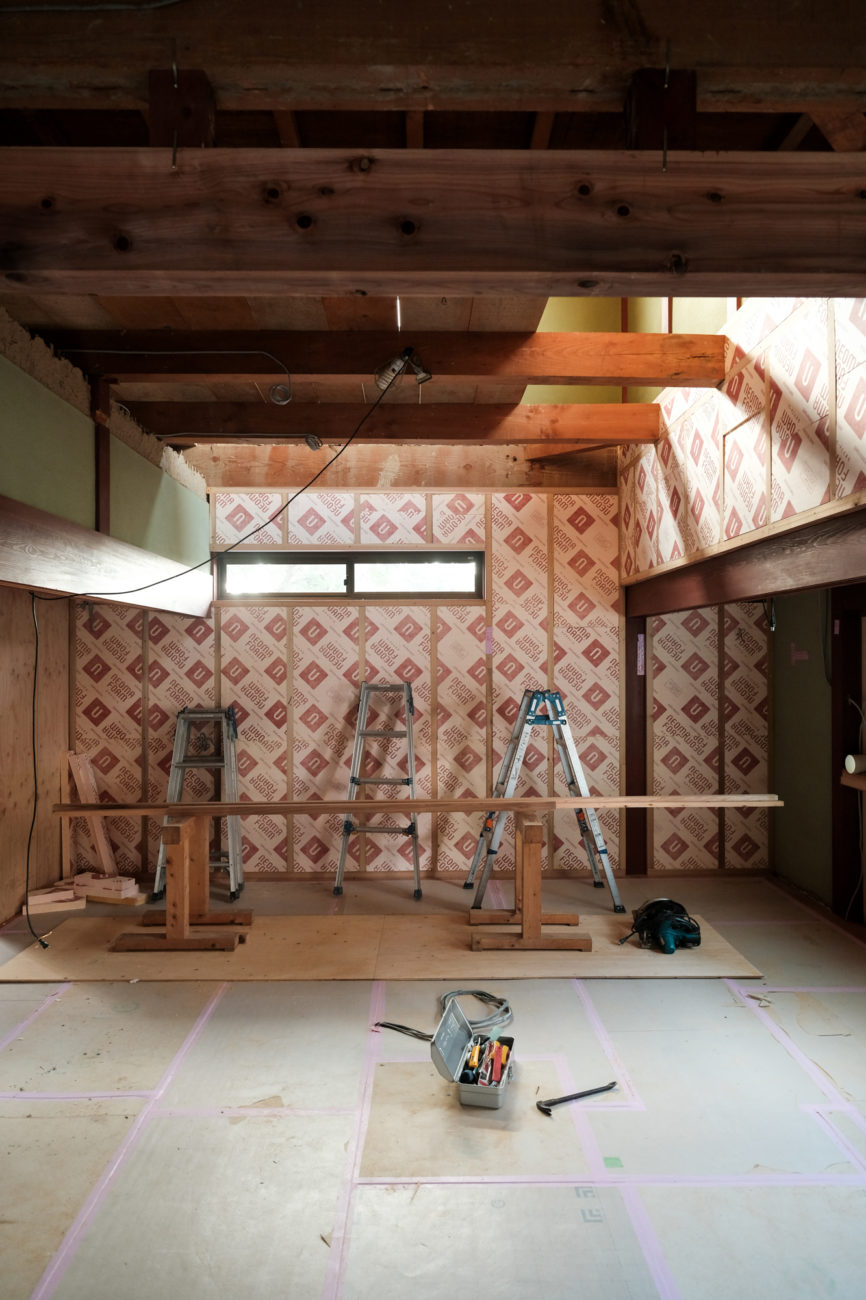 彦根市にて古民家リノベーションが進んでいます。 断熱改修をしっかりして、2階の床を一部取り除き採光を確保しています。 古民家は差鴨居の位置が低いのですが、逆にこれを活かし天井高にメリハリをつける計画としました。 低いところで1800mm、高いところでは2600mm程度の天井高となる予定です。