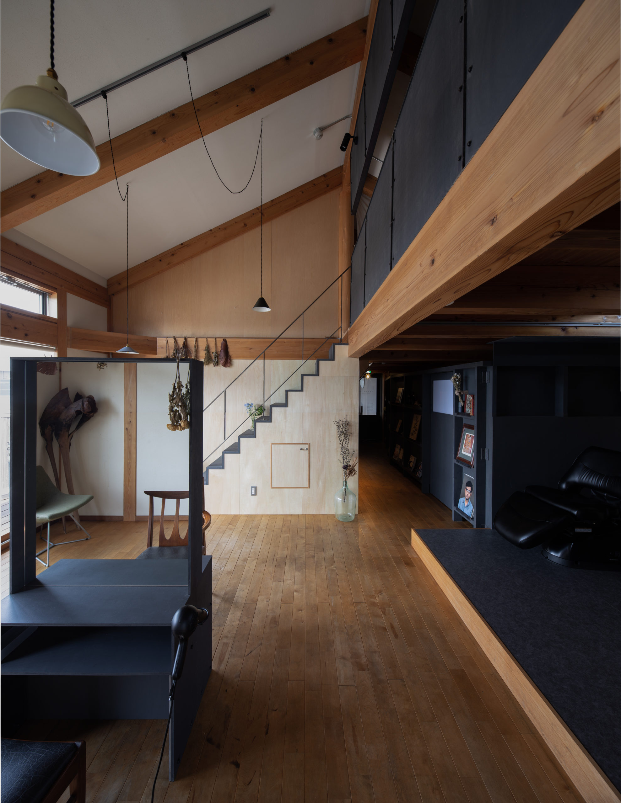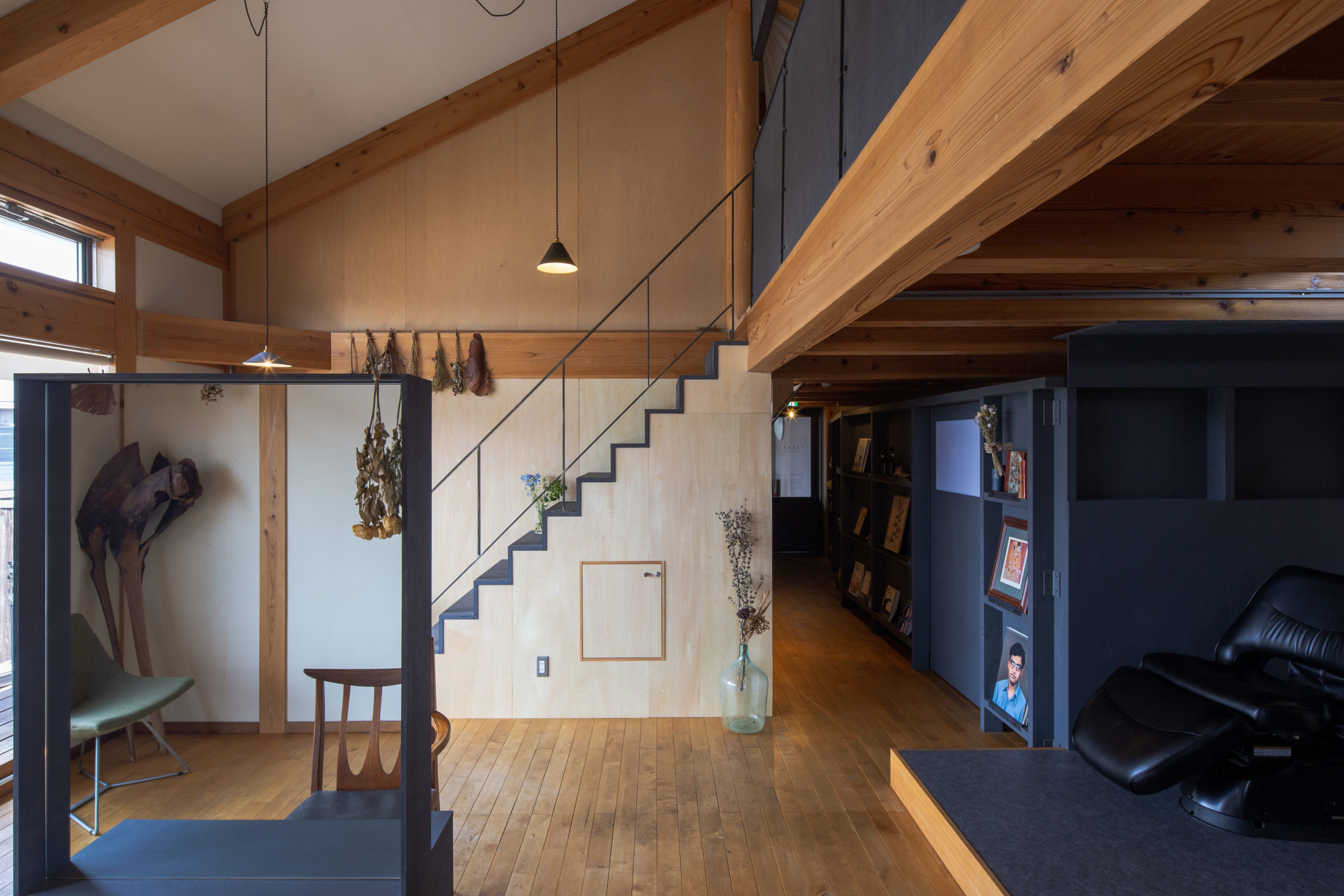 木の素材感を活かしつつも、あえてトーンを抑えた色味を加えることで、空間全体に明暗のコントラストが生まれ、メリハリのある表情豊かなインテリアになっています。