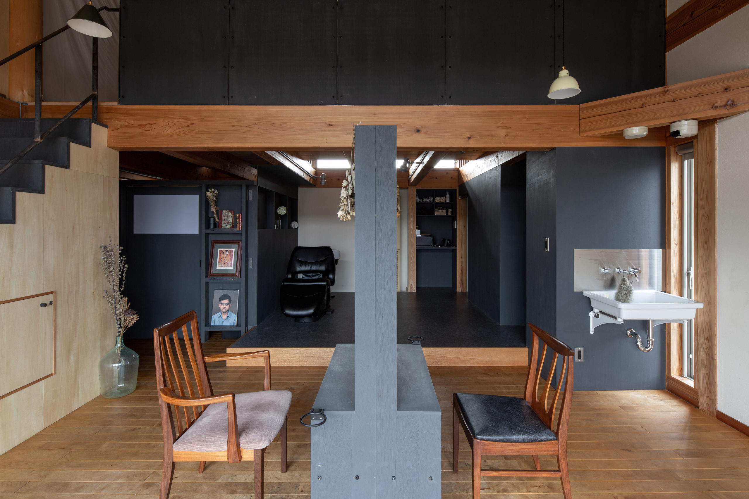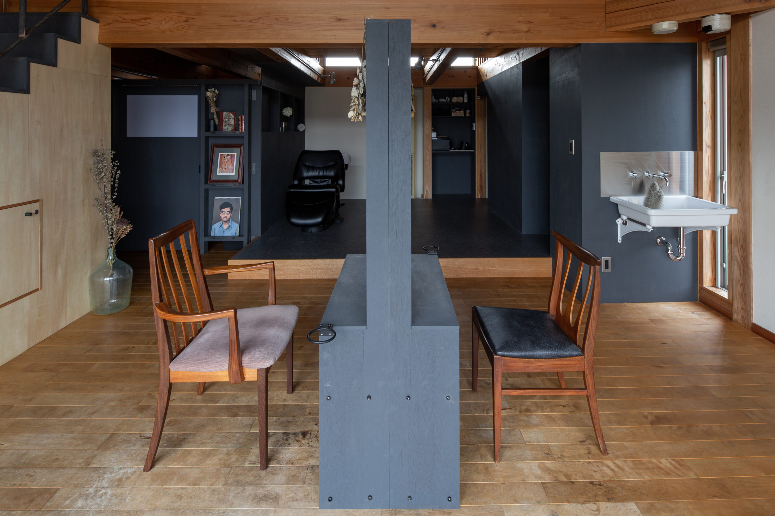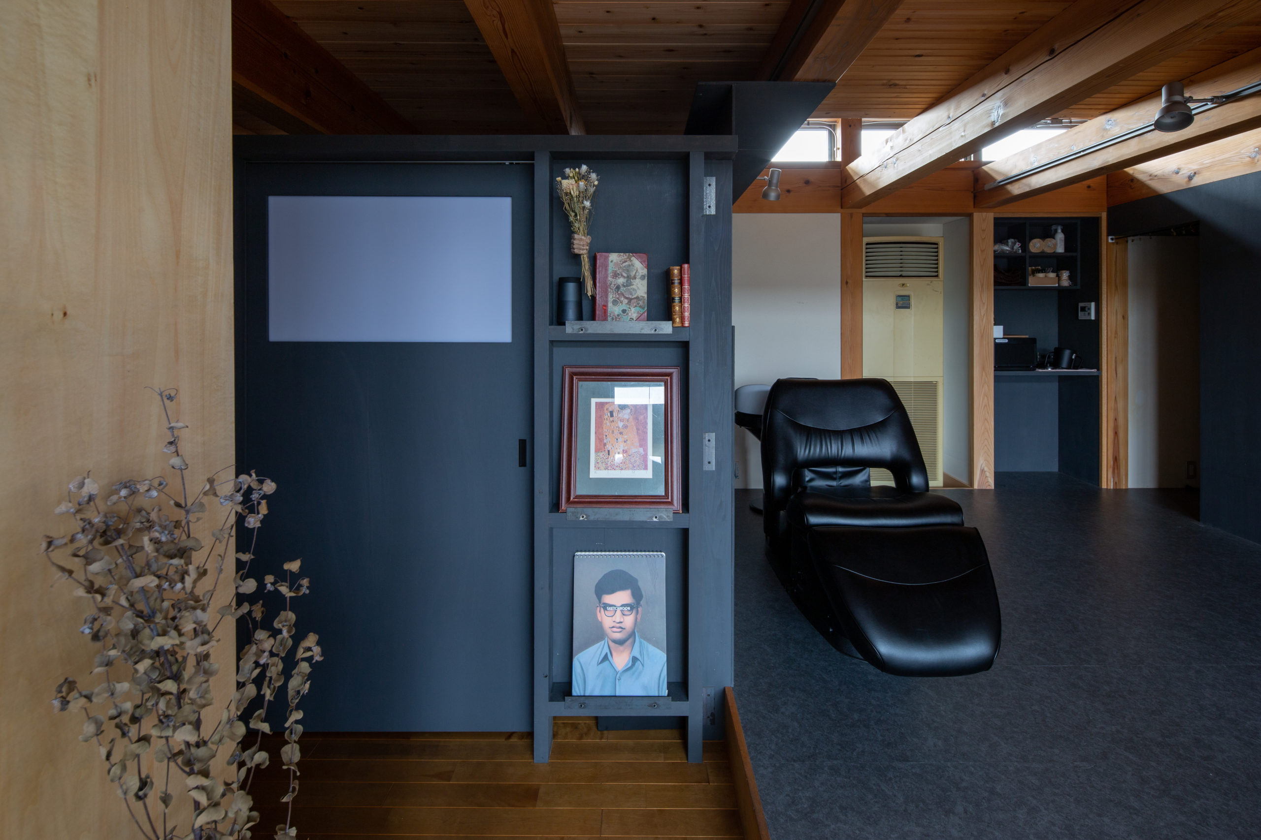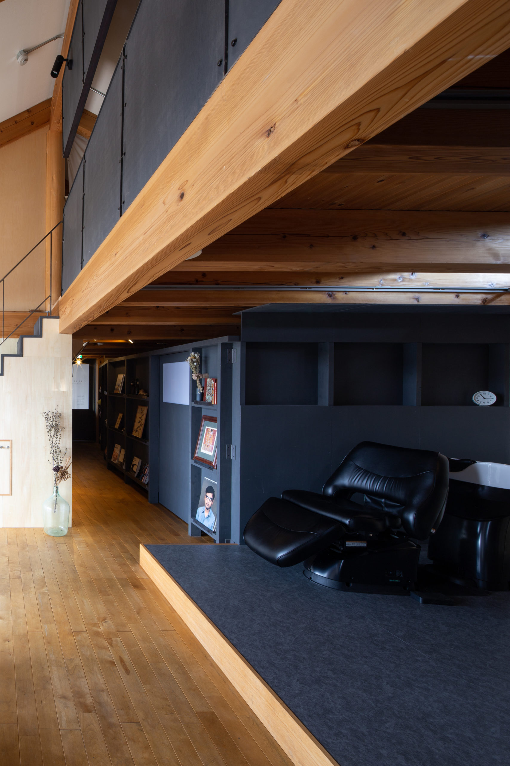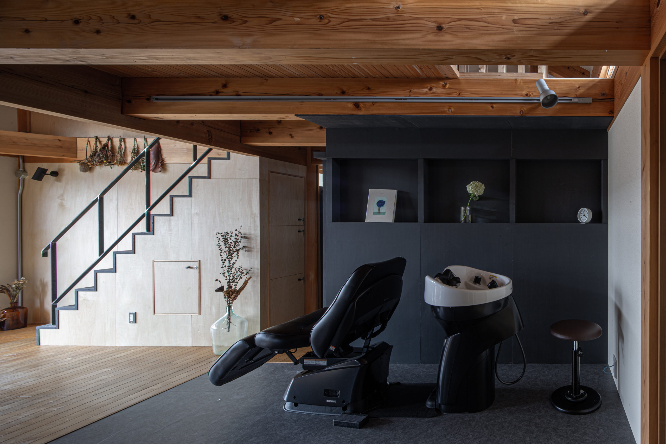 既存の空間は木をふんだんに使った、明るく開放的な空間でしたが、ヘッドスパにおいてはより落ち着きのある暗めの空間が好ましいと考え、空間の質に変化をつけることにしました。