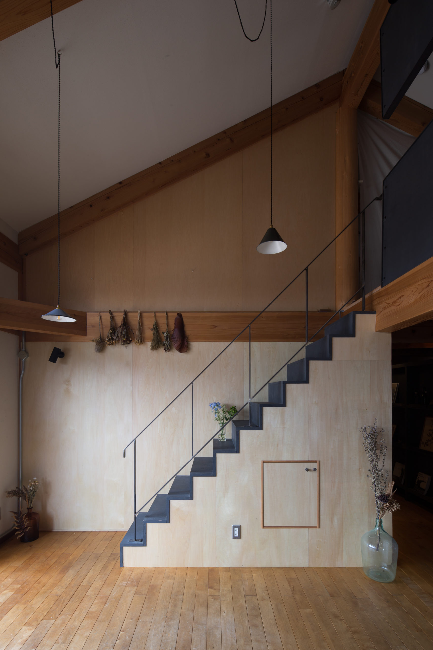ギャラリーには他店舗の吹抜越しに西日が差し込みますが、直接光では強すぎるため、ベニヤ製のリフレクターで光を反射させ、柔らかな間接光として取り入れる工夫をしています。